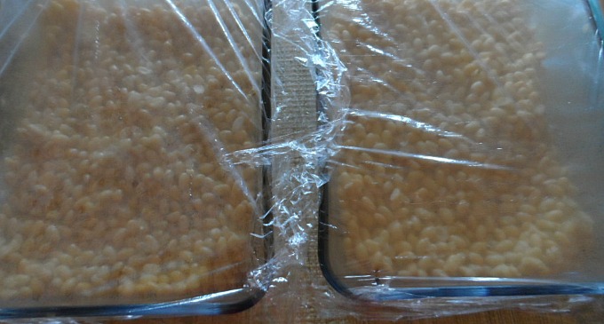 10. Place a clean moistened cheese cloth over the top of the containers and place a lid over the cheese cloth. The trick is to maintain moisture but avoid excess liquid. I have found that a thin sheet of Cling Wrap works well to retain moisture. You may keep a bowl of water nearby to maintain the moisture in the air while fermenting.