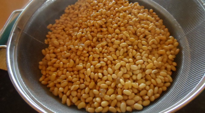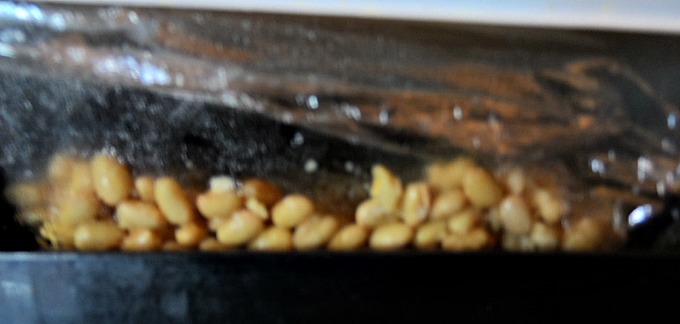 7. Pour the natto spore solution over warm beans.You may also inoculate using natto from a previous batch.
