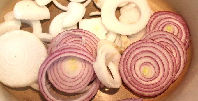 1. Place sliced onions on the bottom of a slow cooker or dutch oven. (I love the Le Creuset dutch oven.See more about safe cookware