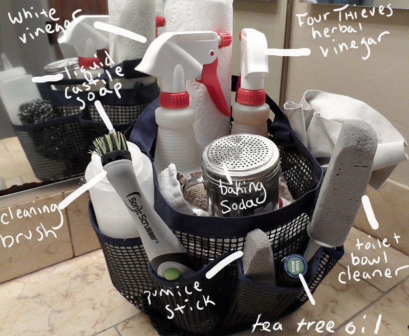 Every Saturday morning I grab this tote and scour the bathrooms using chemical-free, inexpensive products. I’m free of hazardous vapors and my bathrooms still sparkle!